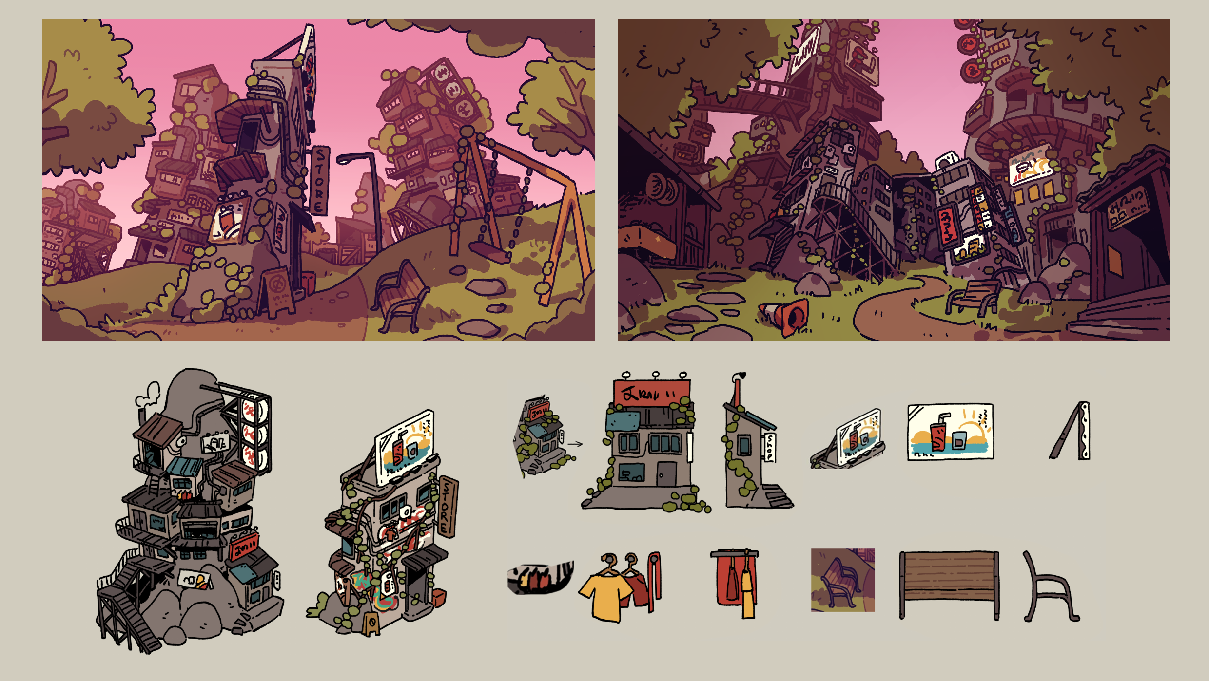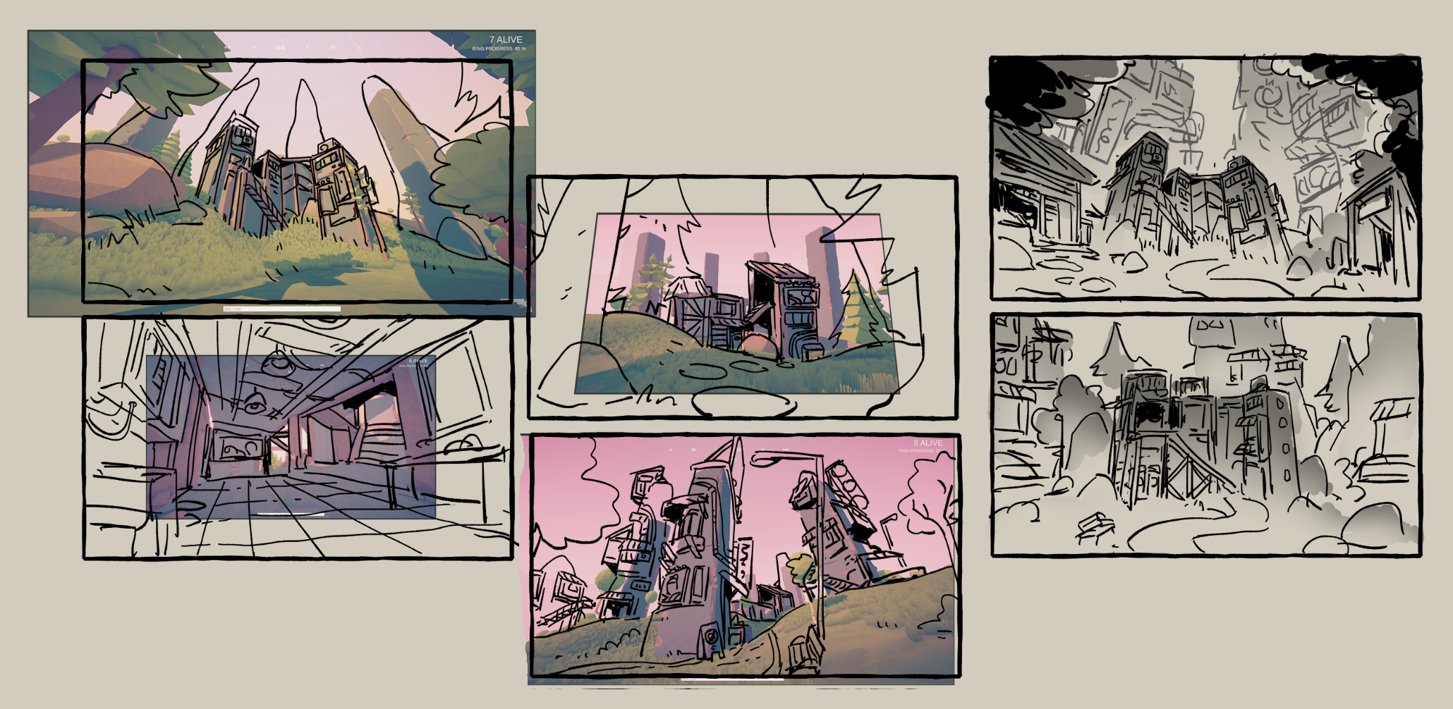 I was tasked to design a map location for TABG following my own worldbuilding rules of urbanscapes. The project included concept sketches, isometric dioramas, and prop callouts.